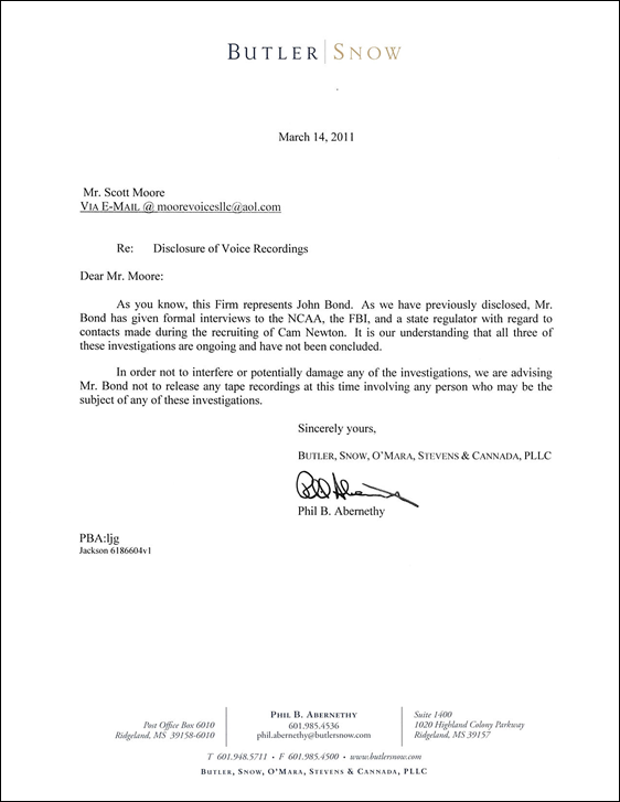 The letter also serves as the most convincing evidence yet that Moore was telling the truth about the existence of the recordings, their reported contents and the existence of ongoing investigations into the recruitment of former Auburn Quarterback, Cam Newton.